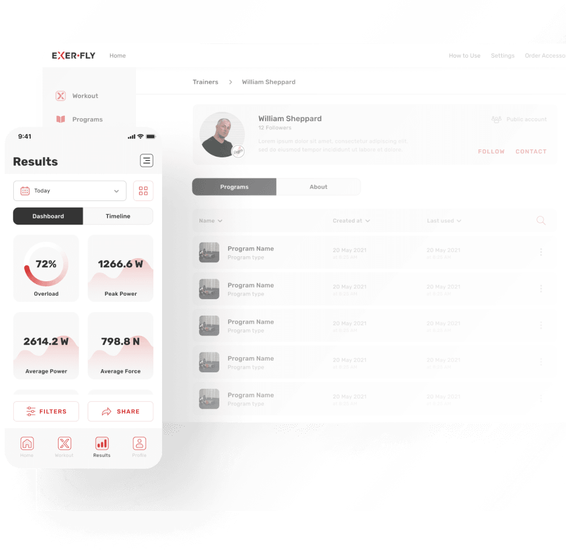 Exerfly equipment includes an easy to use app for IOS, Android and in your web browser. The app controls the equipment and helps you to monitor statistics such as velocity, time, force, power, energy, torque, RFD, momentum, angular momentum and weight moved for each rep, concentrically and eccentrically.